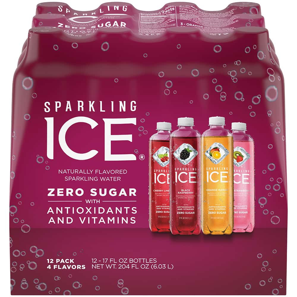 Enjoy four great sparkling beverage flavors, without calories or sugar, with this delicious variety pack. Each fizzy sip of Sparkling Ice is bursting with real fruit flavor. This pack includes 3 black raspberry, 3 cherry limeade, 3 kiwi strawberry, and 3 orange mango.
